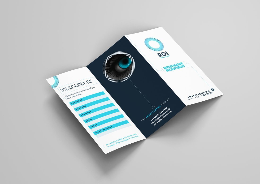 RGI Solutions needed a document to hand out at a recruitment event they were attending. The original options were to prettify a single page document in Microsoft Word which the client could then print out internally as handouts. I felt that to boost recruitment at such an event they needed to look more professional (as they are experts in their field after all) and that the leaflet should entice receivers to take a look and complete a form there and then.